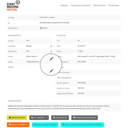 Neben den Eckdaten der Event-Anfrage werden nun auch die direkten Kommunikationsdaten des Interessenten (Telefonnummer & eMail-Adresse) mit ausgegeben, um ein einfacheres und schnelleres Nachfassen zu ermöglichen.