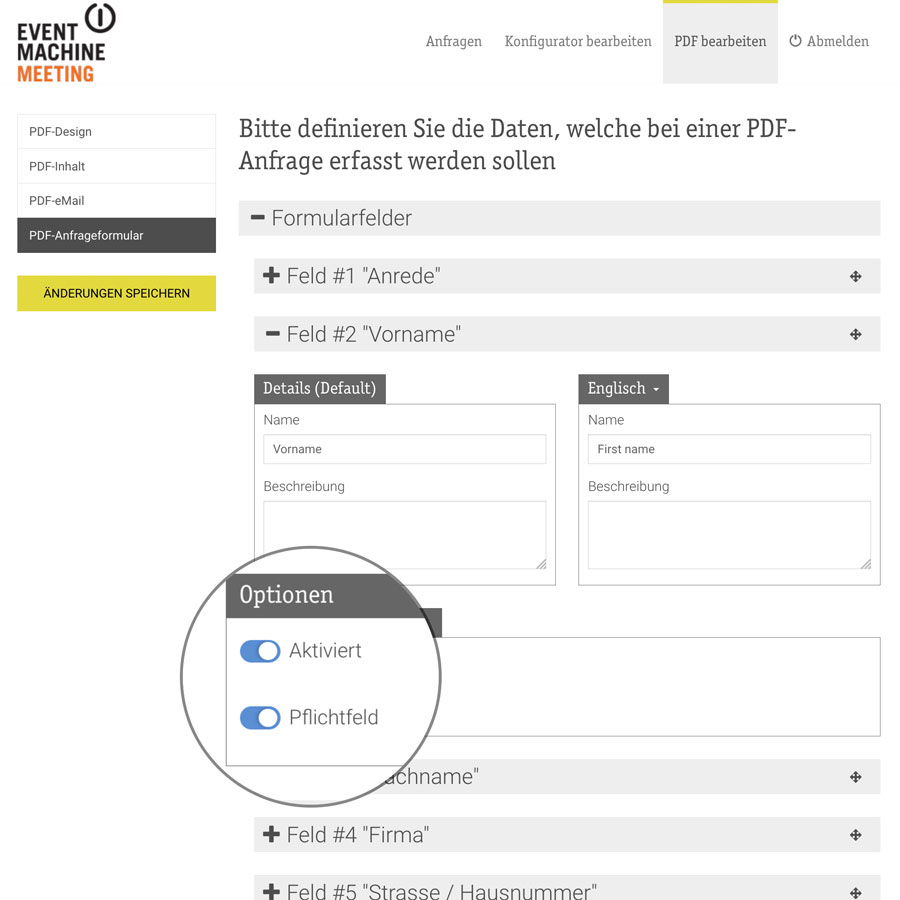 Die Felder des PDF-Anfrageformulars können nun frei definiert werden. Bestimmen Sie, welche Felder angezeigt werden und welche Pflichtfelder sein sollen. Zudem kann die Reihenfolge festgelegt und eigene Felder eingerichtet werden.